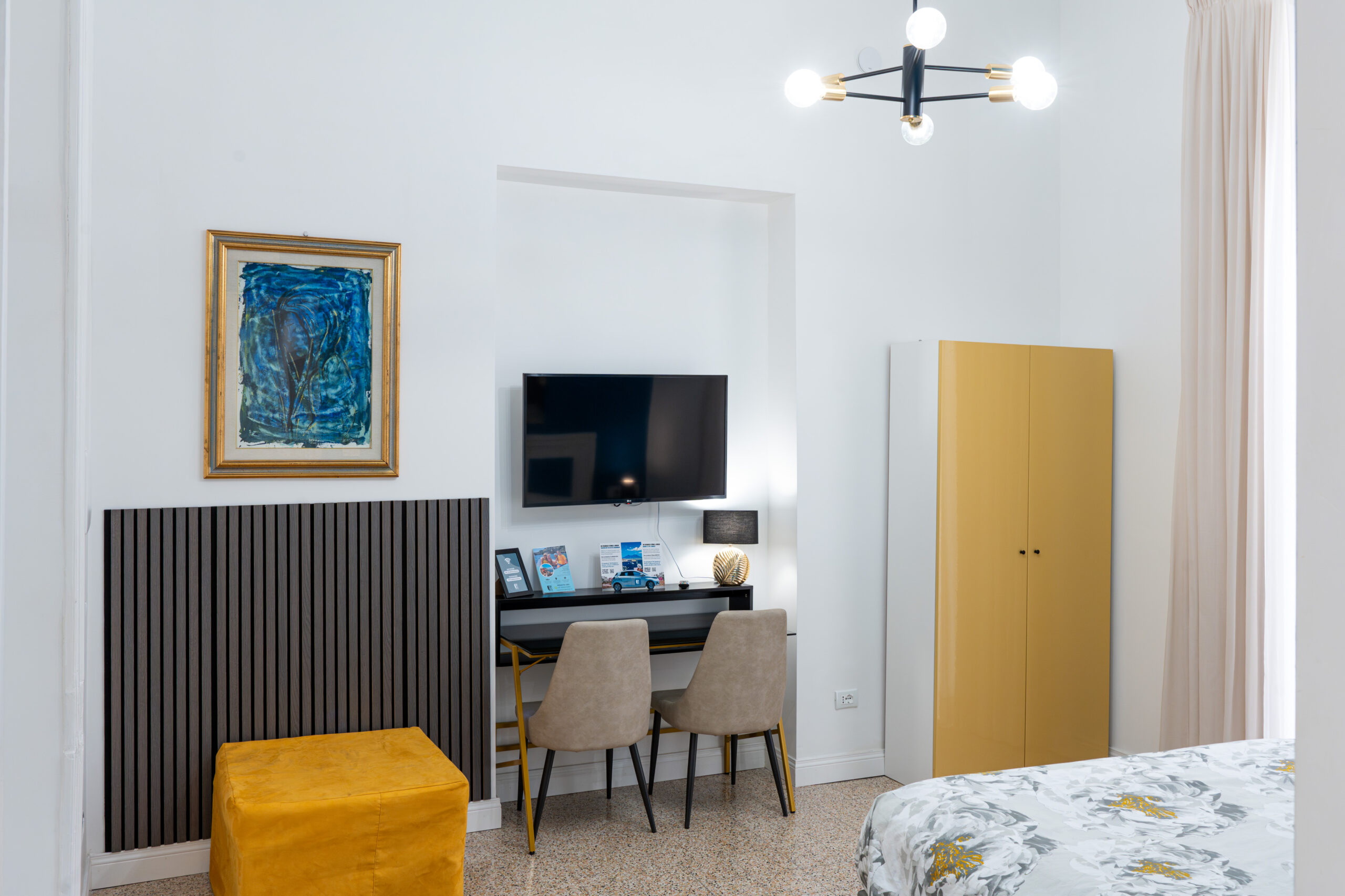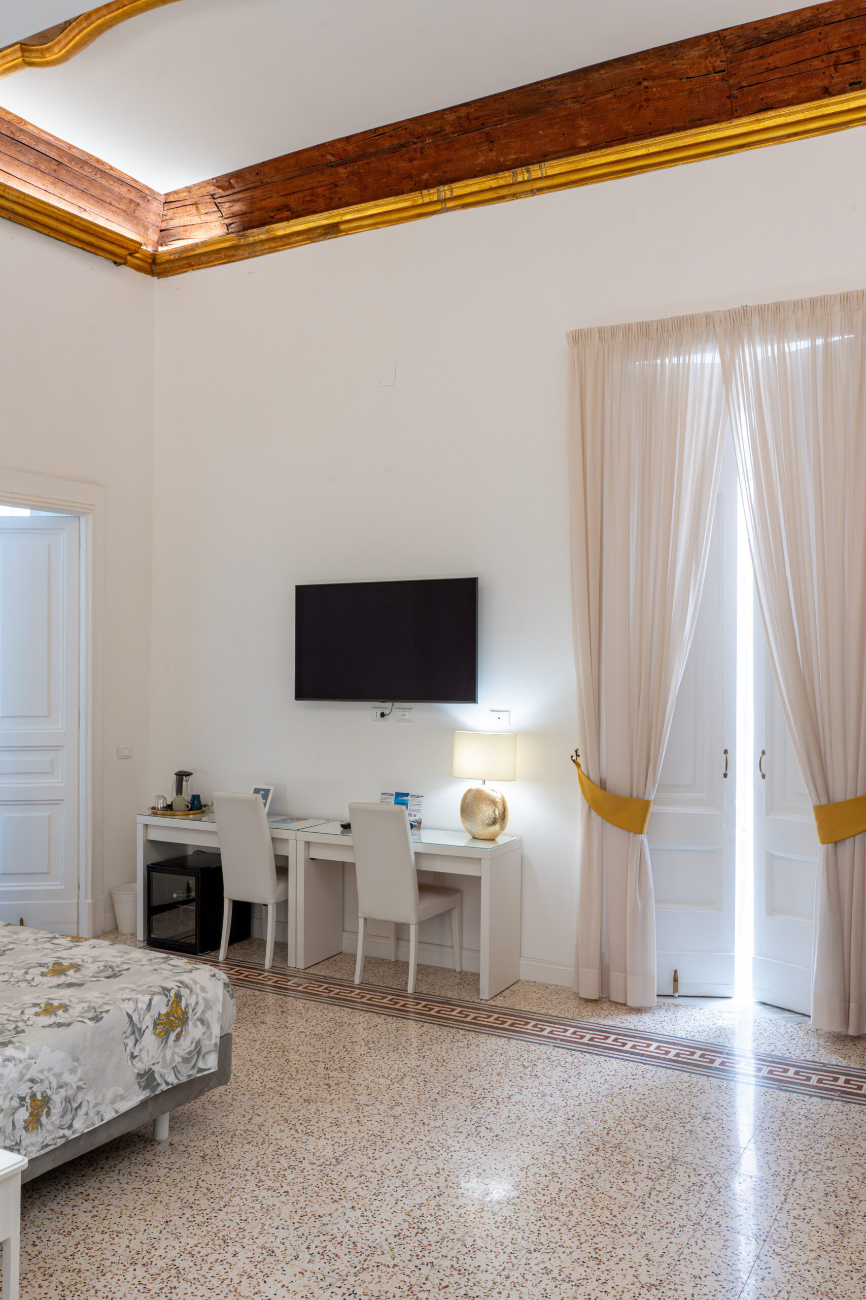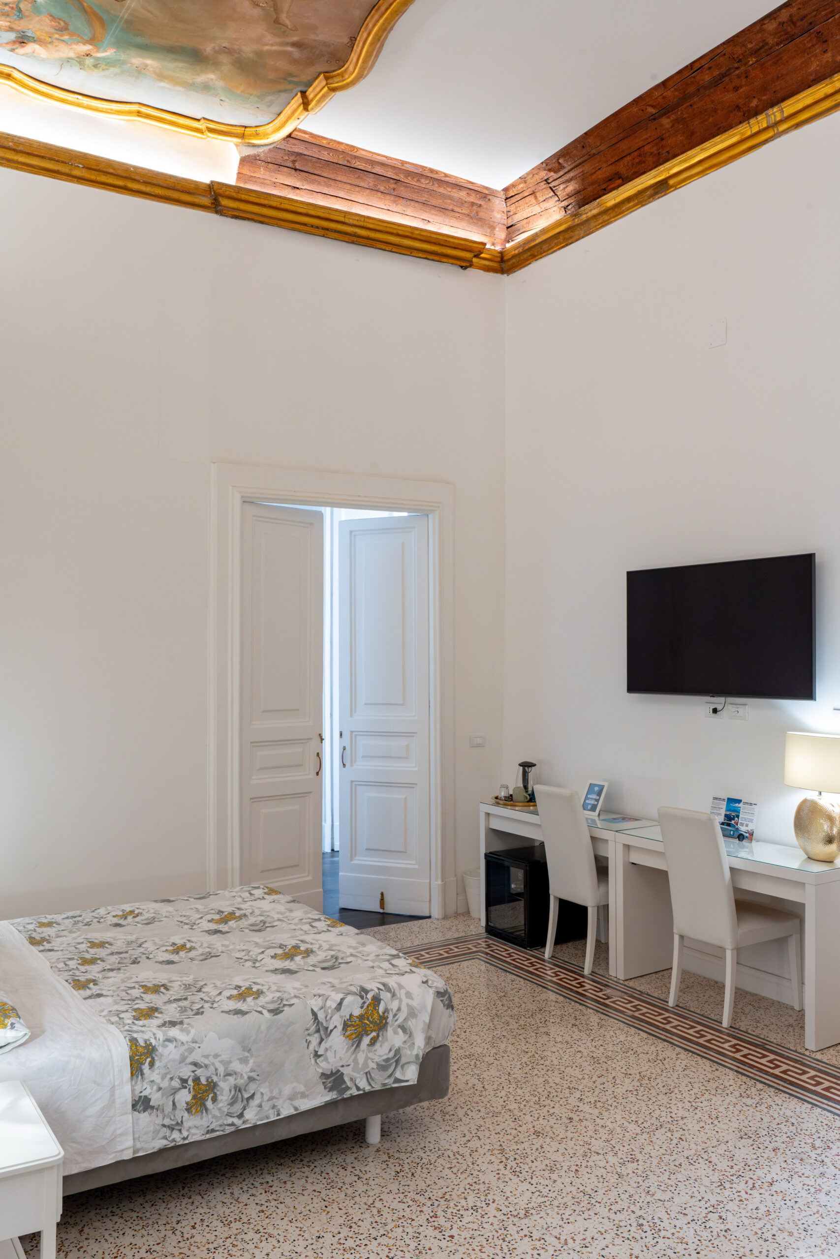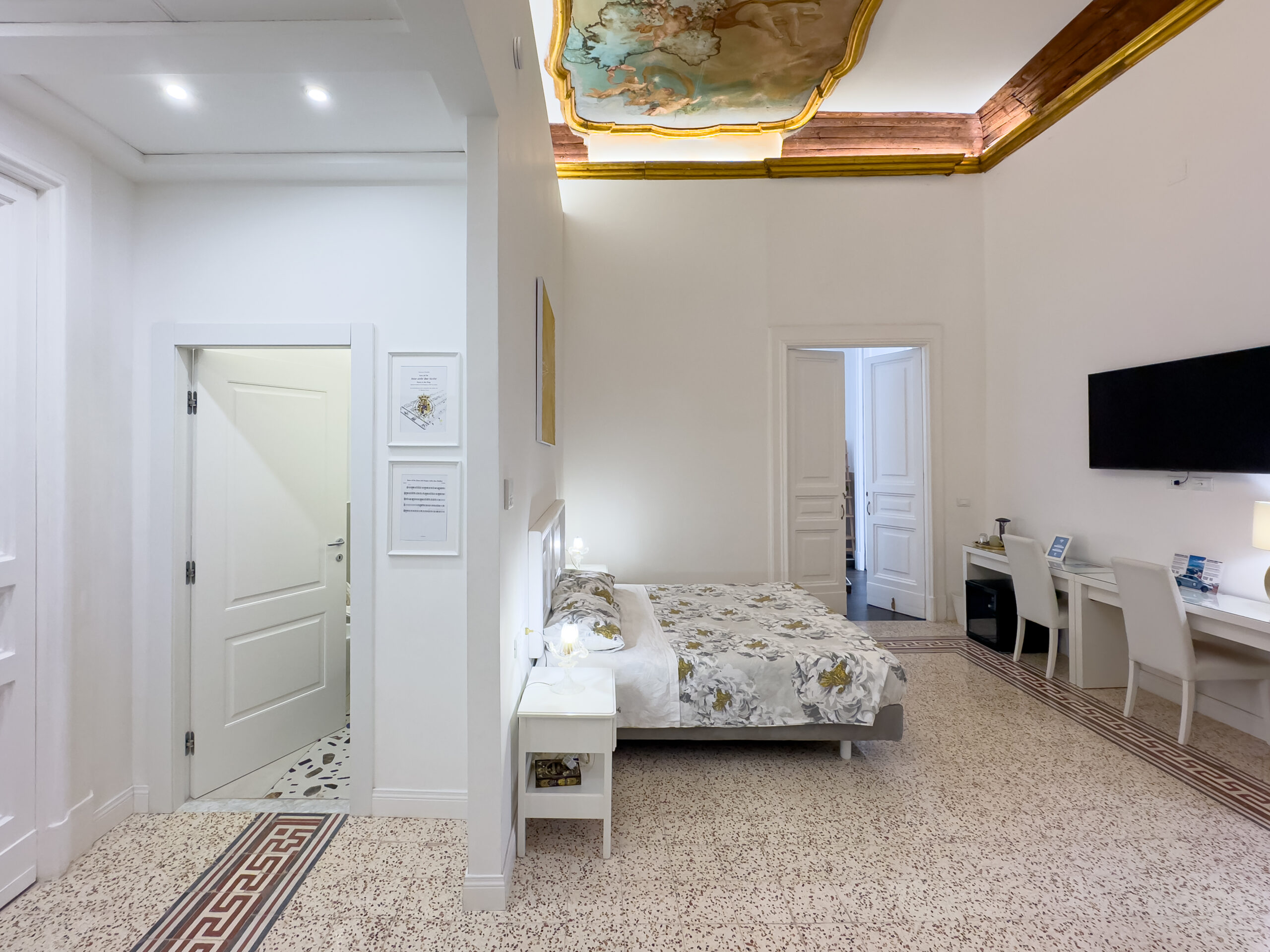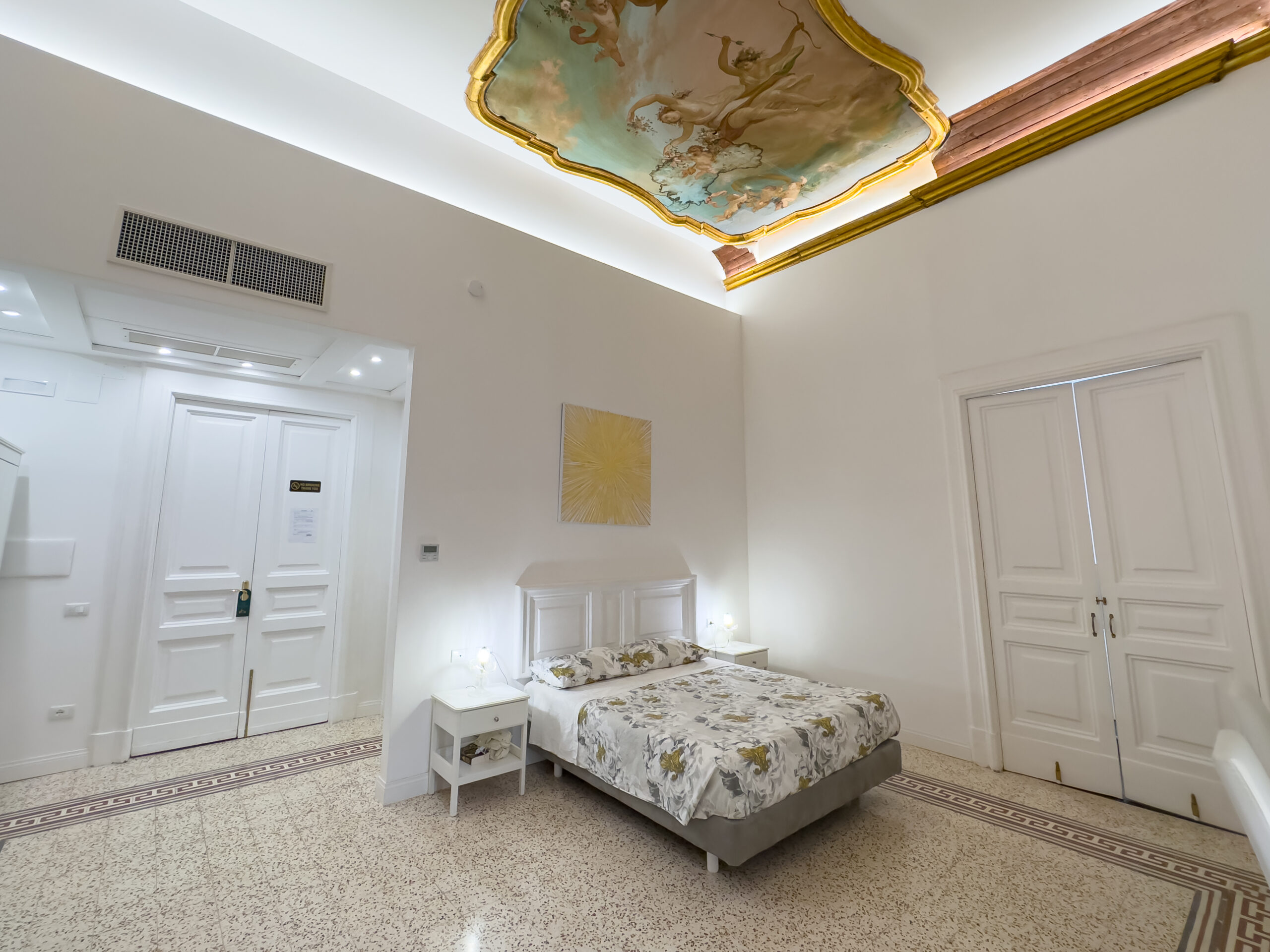 Un’atmosfera raffinata e affascinante vi accoglierà, grazie a una ristrutturazione che ha saputo valorizzare gli antichi splendori, come i pavimenti originali in marmo, le porte in legno, gli affreschi e le cornici dorate. Ogni camera è un riflesso del suo passato, arredata con sobrietà ed eleganza, arricchita da dettagli che richiamano le opere musicali di Paisiello.